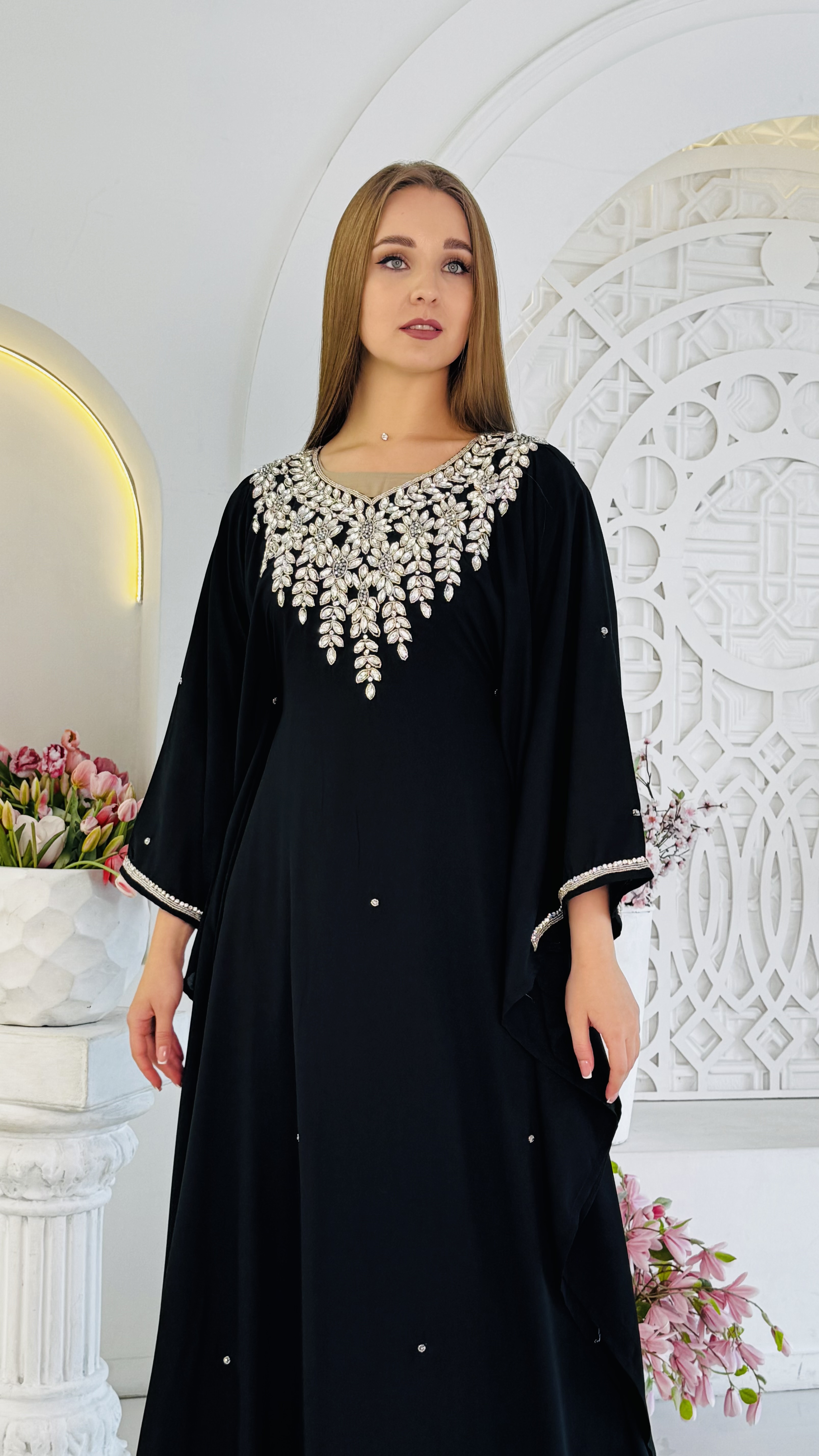 На фотографии представлена элегантная черная арабская абая, представляющая собой стильный образец мусульманской одежды. Основные особенности: Цвет: Классический черный цвет придает абае универсальность и элегантность. Фасон: Абая имеет свободный, прямой крой, обеспечивающий комфорт и соответствующий требованиям скромности. Вышивка: Воротник и частично грудь украшены изысканной вышивкой из белых камней и бисера. Вышивка выполнена в виде стилизованных цветочных мотивов и листьев, что придает наряду нарядный вид. Детали: Рукава абаи широкие, три четверти, также декорированы небольшой полоской вышивки по краю. На самом платье присутствуют отдельные элементы вышивки, разбросанные по ткани. Ткань: Ткань выглядит матовой и плотной, что соответствует требованиям мусульманской одежды. Эта абая сочетает в себе традиционный фасон и современный дизайн, делая ее подходящей для особых случаев и религиозных праздников.
