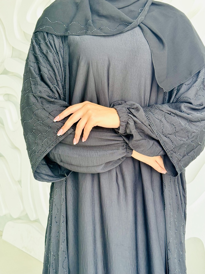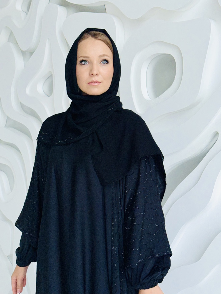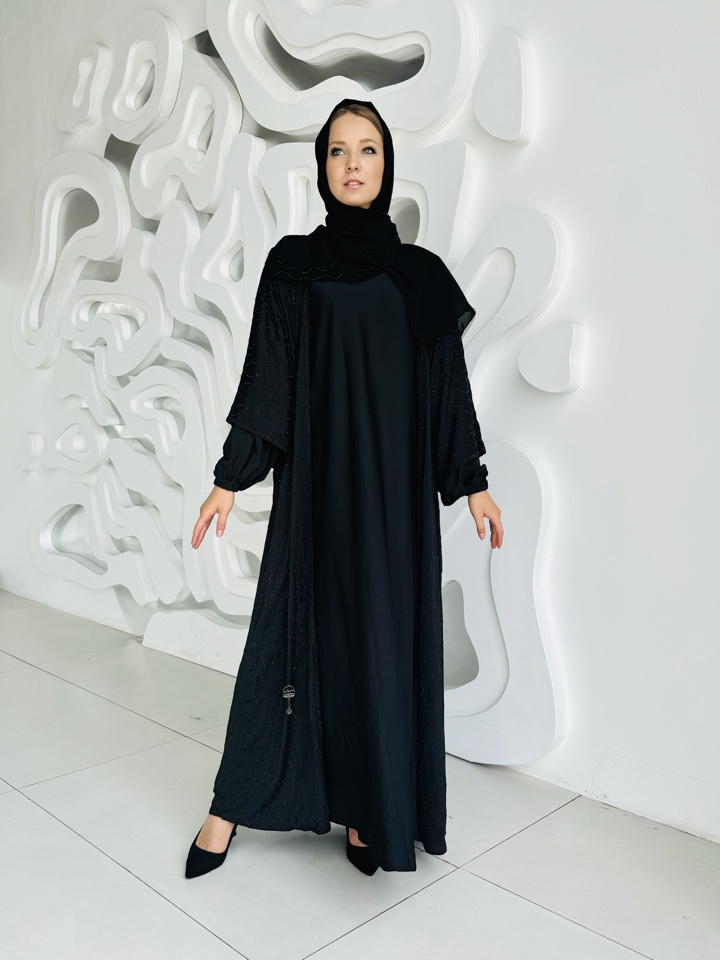 Костюм тройка состоящий из базового платья с длинным рукавом, абая рукав три четверти , декор всей абаи из черных мерцающих страз, прилагается палантин , ткань купра люкс. Размерный ряд от 44-52. Производтво ОАЭ.