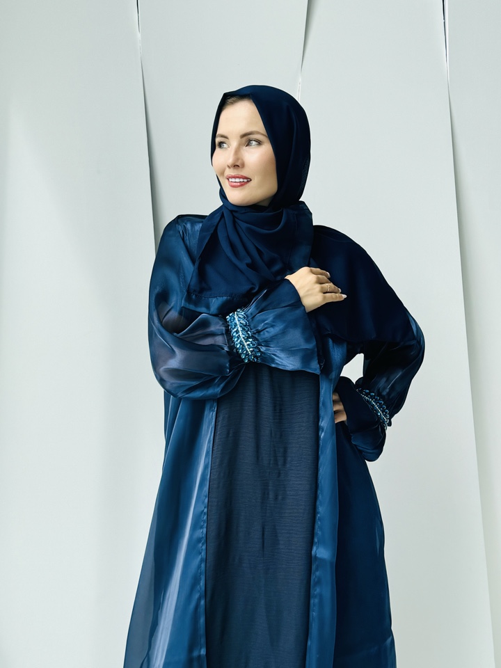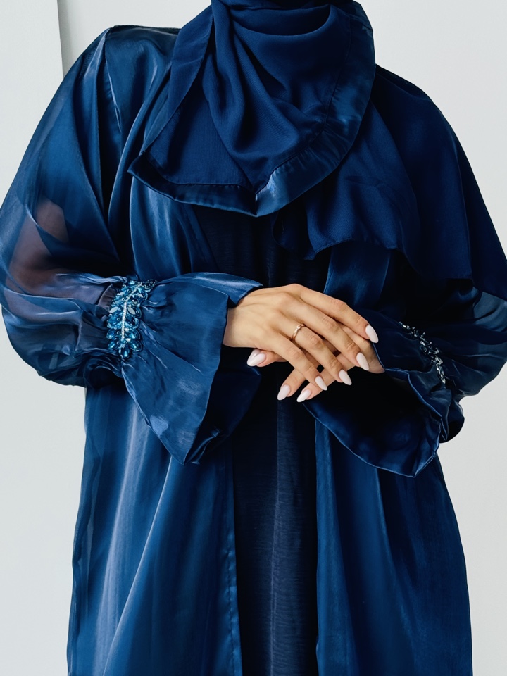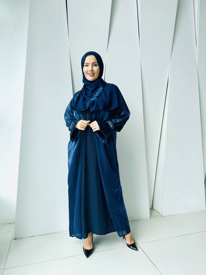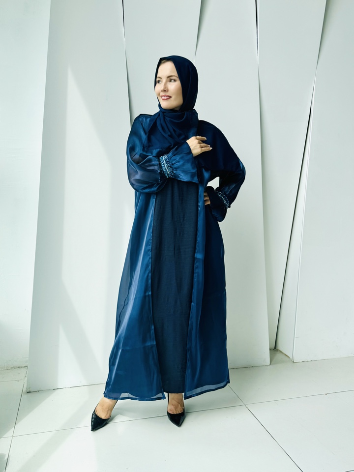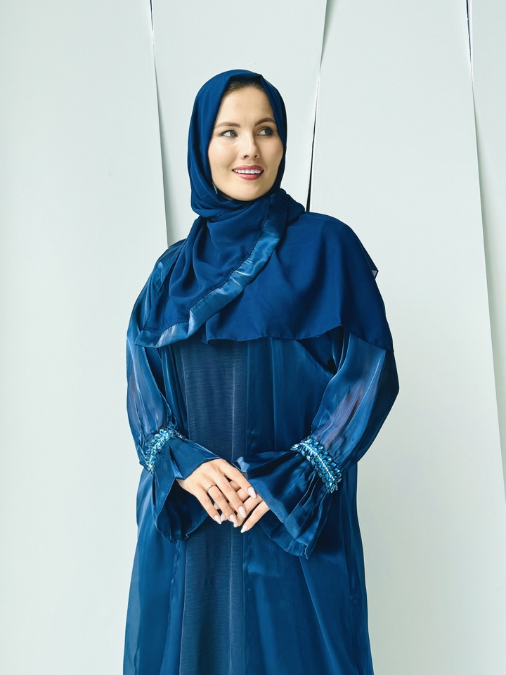 Мусульманская Абая Кираз- тройка ,палантин уже входит в комплект.Декорирована синими камнями на манжете.Производство ОАЭ, размерный ряд от 44-54
