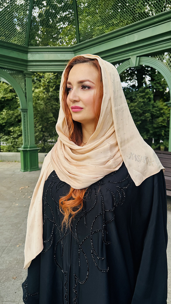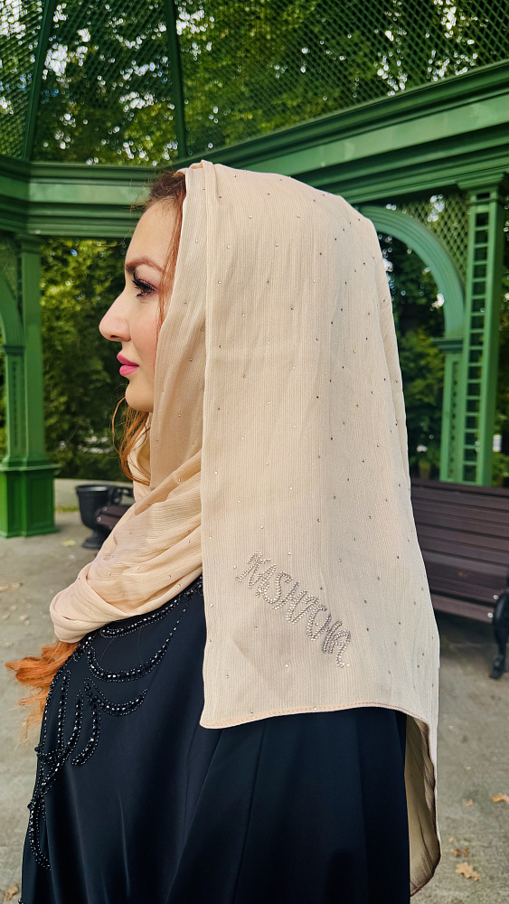 Элитный палантин хиджаб известного бренда из Объединенных арабских эмиратов Kashkha, бежевого цвета из шифона люкс со стразами. Размер 70 на 170.