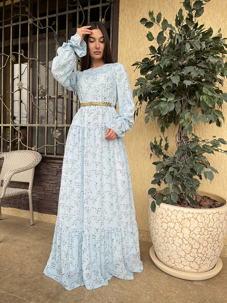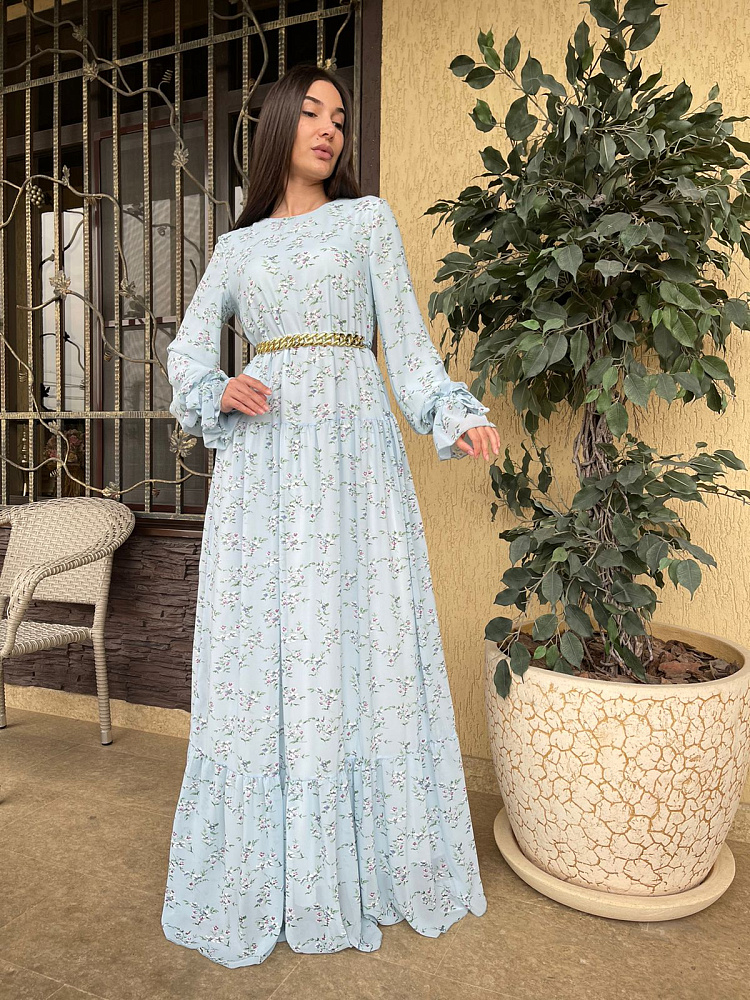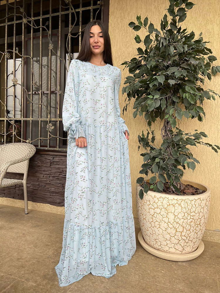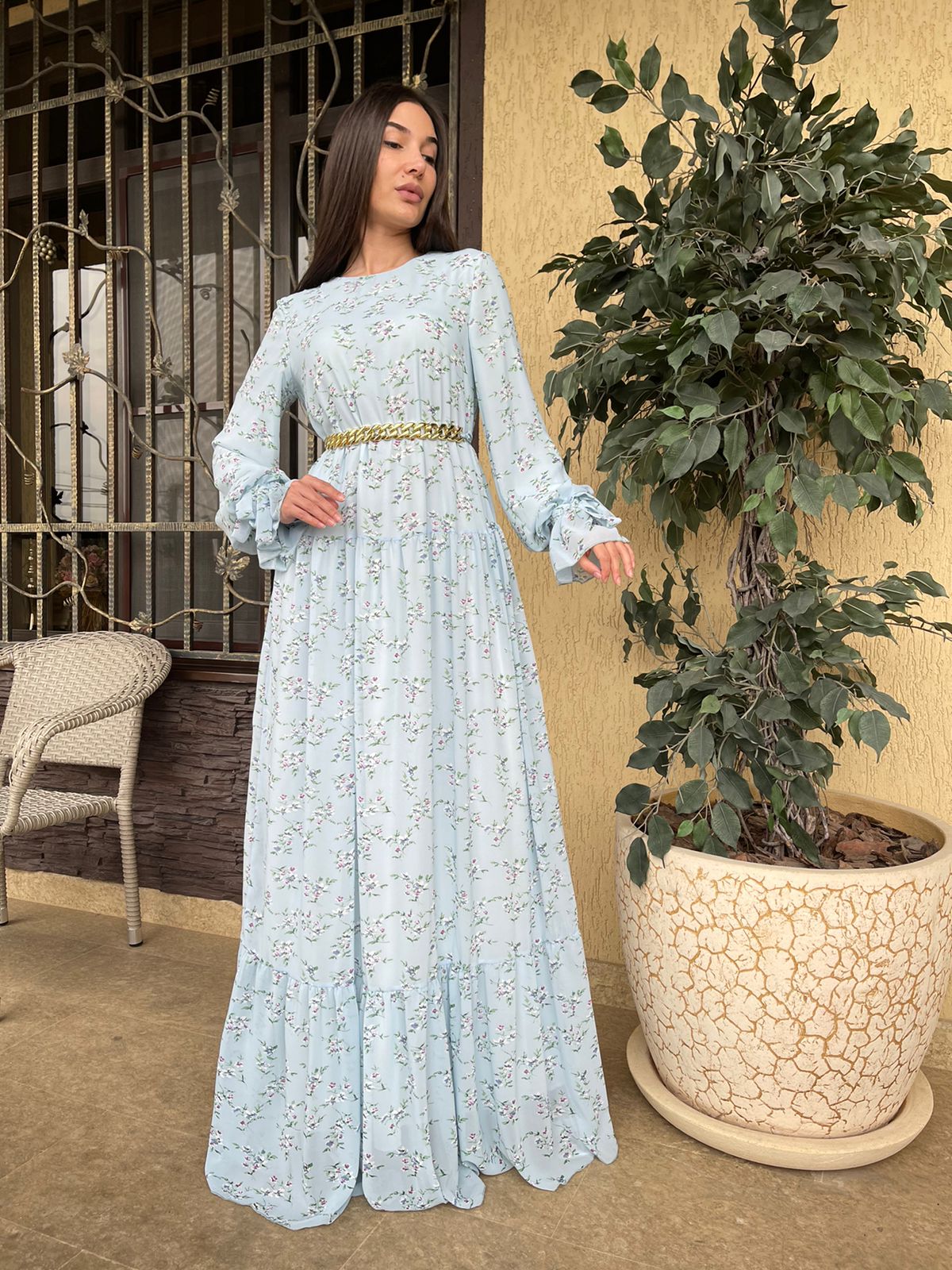 Летнее платье из креп шифона на подкладе с нежным цветочным принтом на голубом фоне. Размер 46-48.