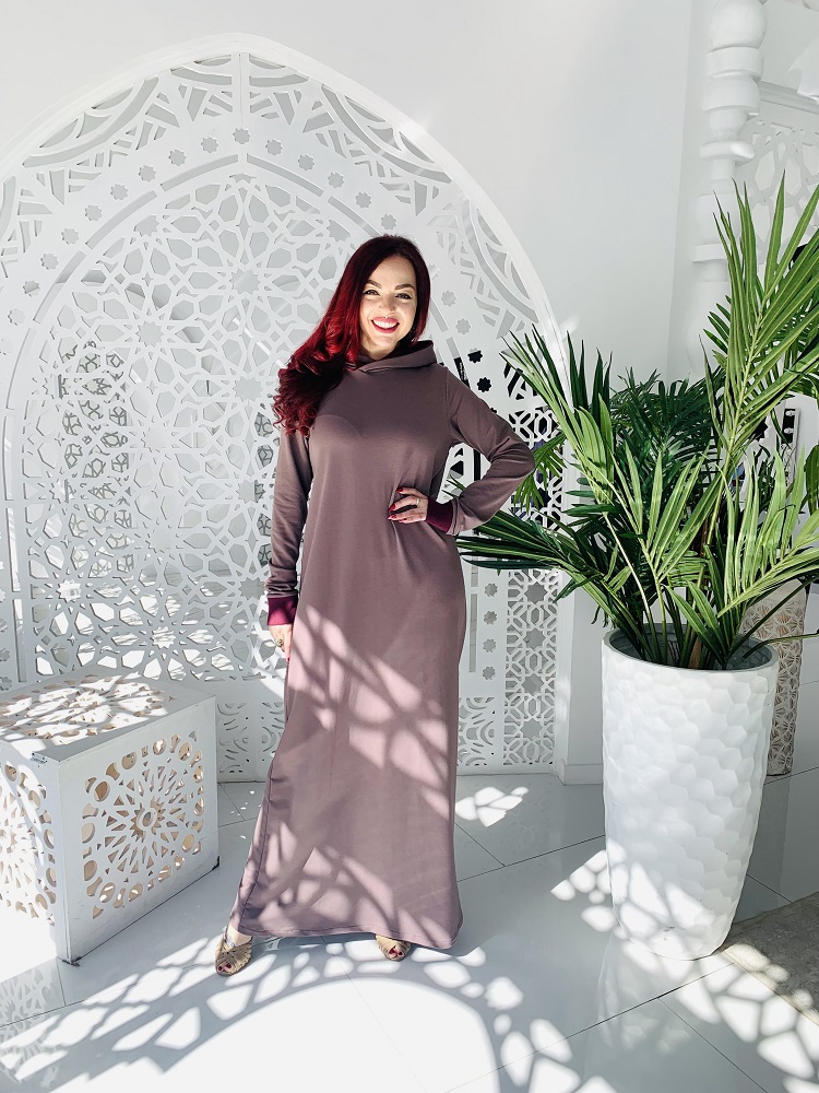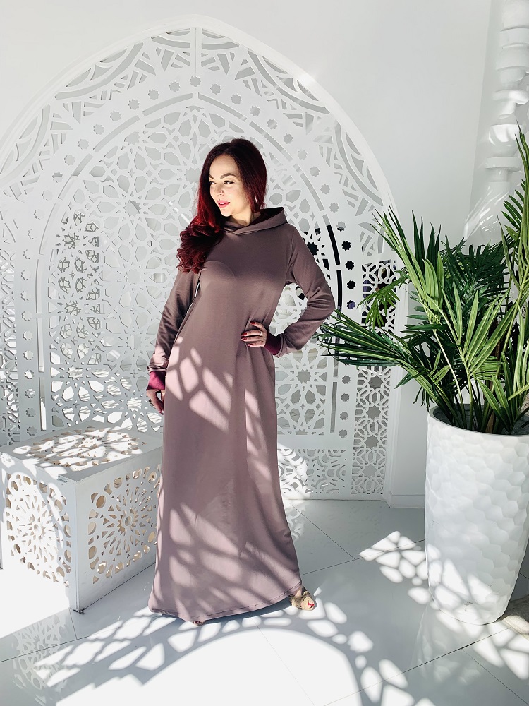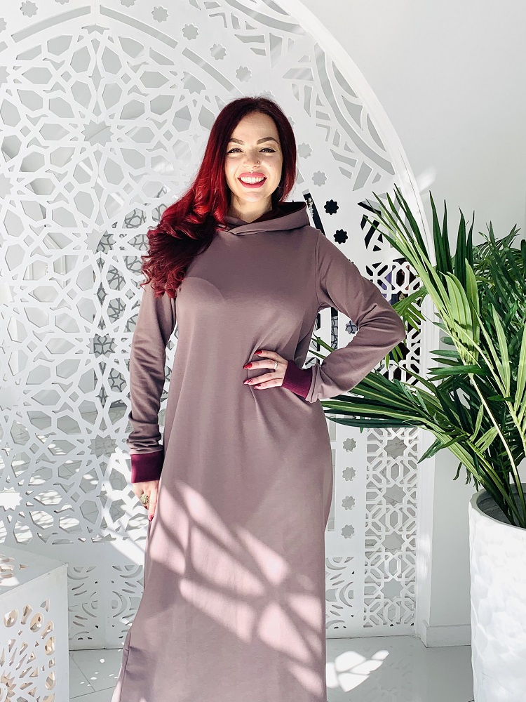 Платье худи кофейного цвета из футера двухнитки, с капюшоном. Размер 44-46-48. Производство Ателье Фатмафэшн