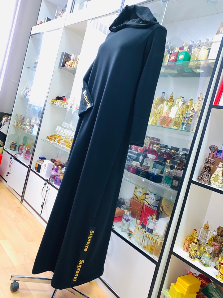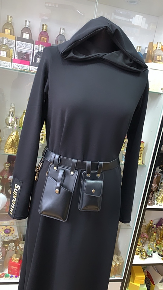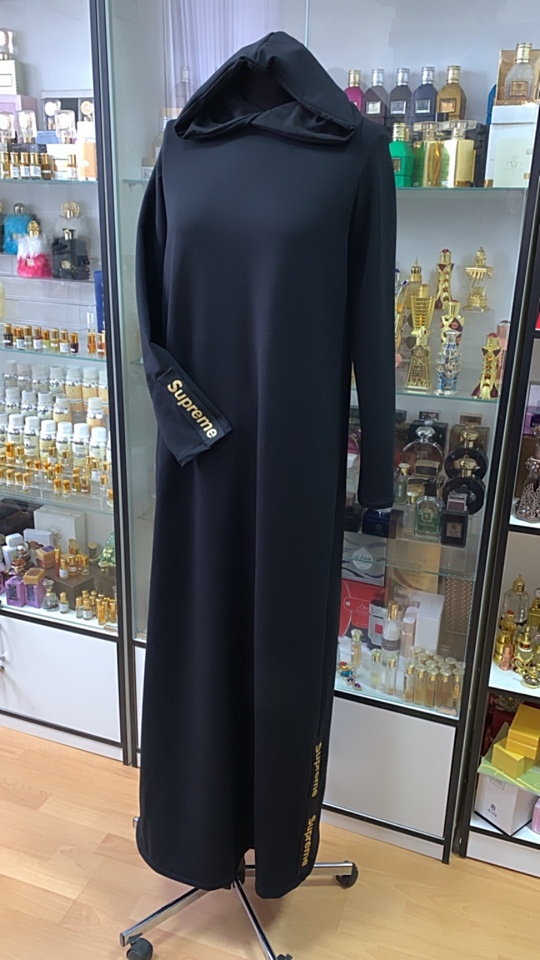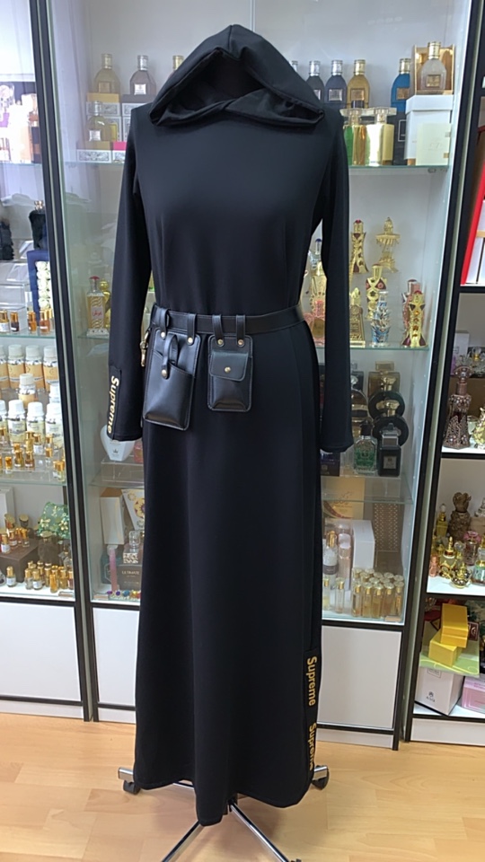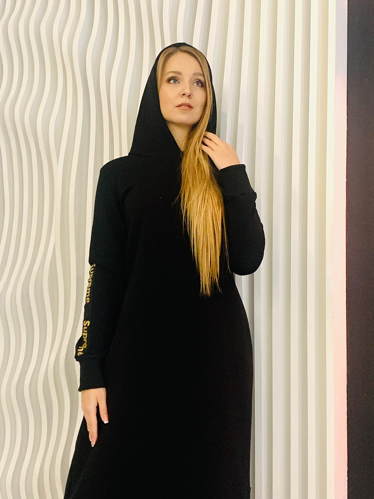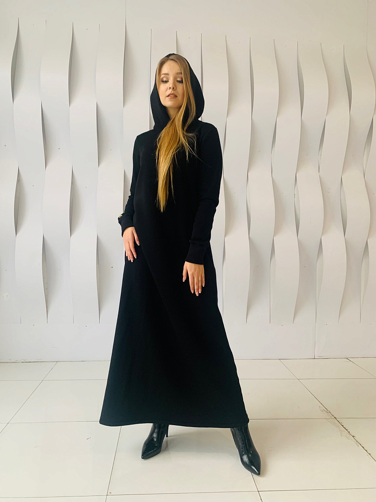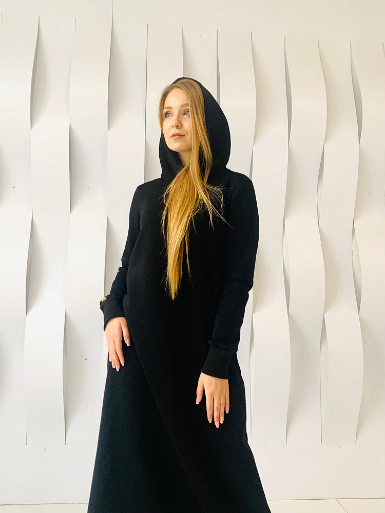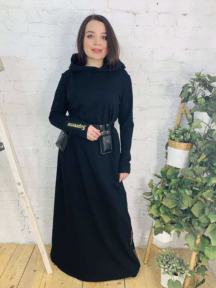 Стильное платье худи А-силуэта, черного цвета из футера с начесом, декор - резинка с надписью. Платье с капюшоном, размер 46-48-50. Коллекция осень -зима- весна. Длина платья 145-147см.