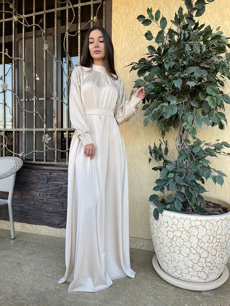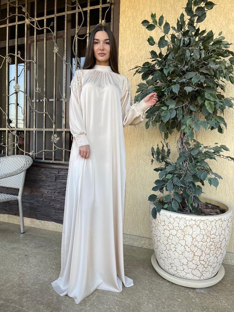 Роскошное платье для праздничных мероприятий из шёлк армани цвета экрю, размер 46-48-50. На рукавах декорировано стразами