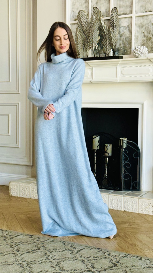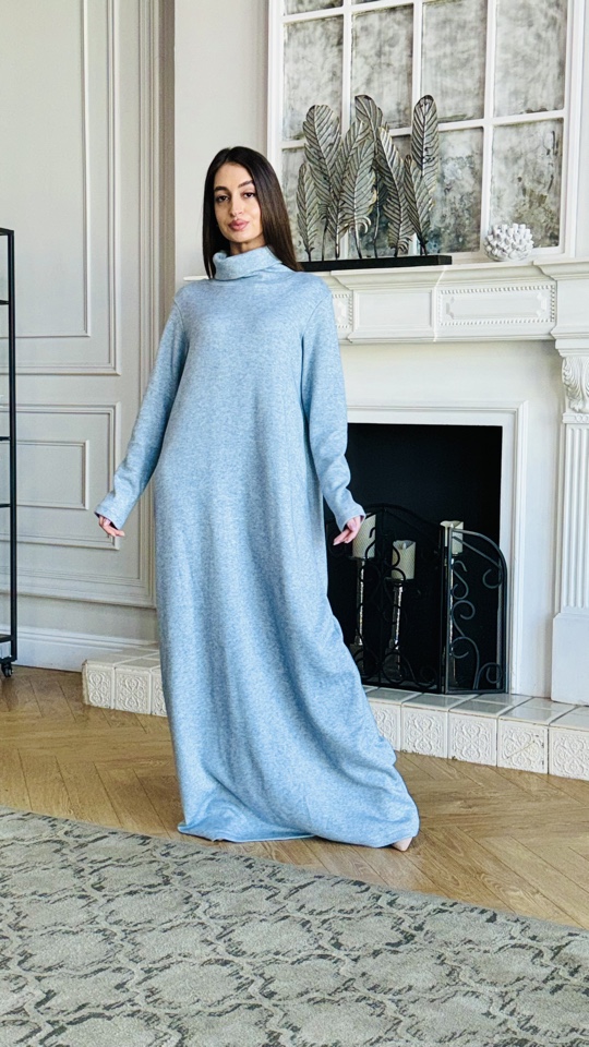 Платье Сахара, из ткани ангора , серо-голубого цвета. Крой А силуэта с воротником . Размер 46-50. Рост модели 165 см,размер 42 . Производство Россия.