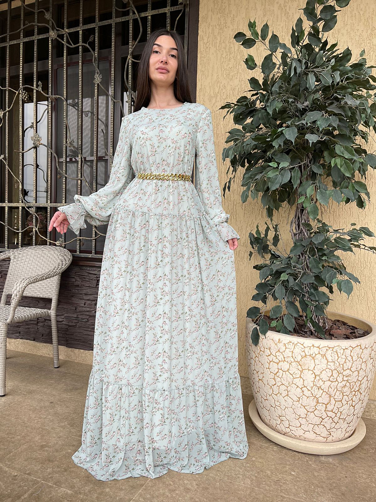 Летнее платье из креп шифона на подкладе с нежным цветочным принтом на мятном фоне. Размер 44-46-48.