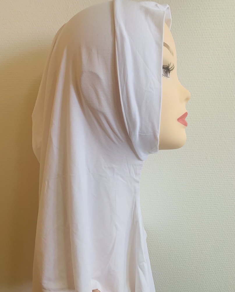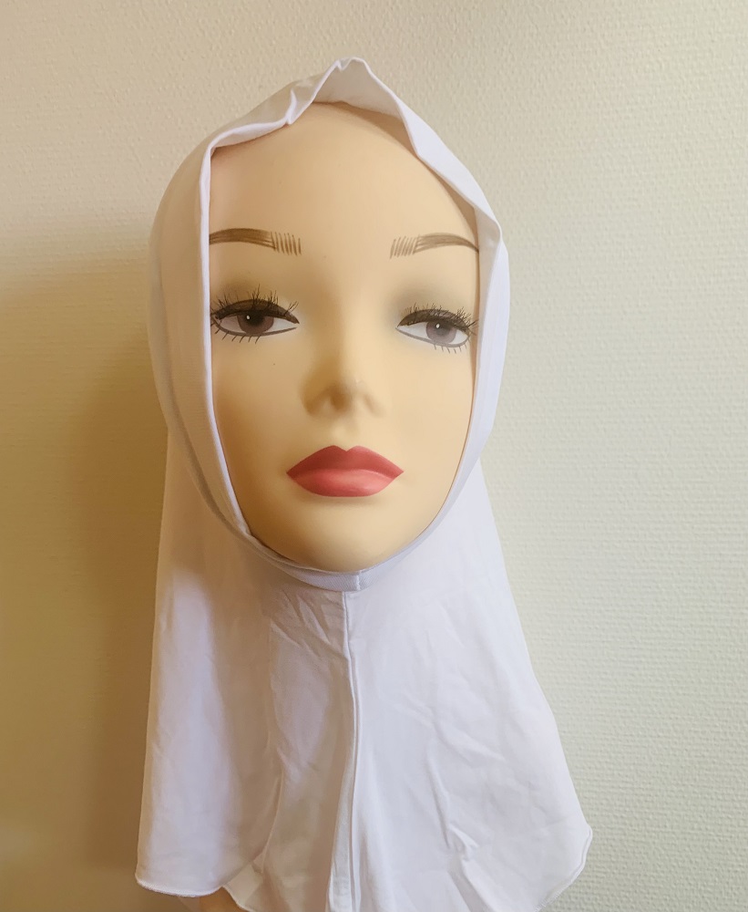 Красивый и удобный подхиджабник белого цвета. Ткань хлопок и лайкра. Скрытые прорези для наушников