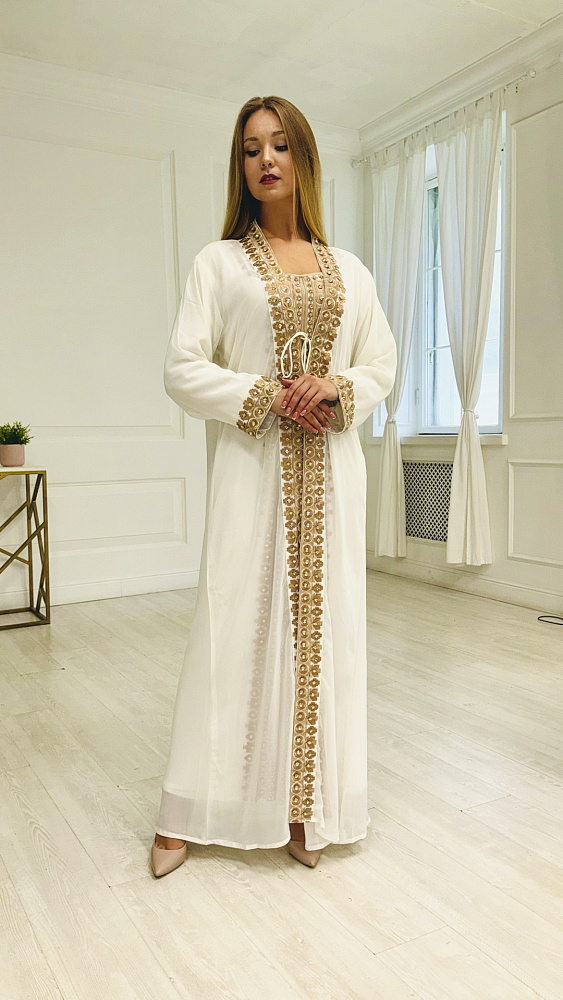 Роскошный кафтан состоящий из шифоновой накидки и платья. Используемая ткань в данной модели-шифон. Идеально подойдет для любой фигуры от 44-54 размера. Декорирована камнями.