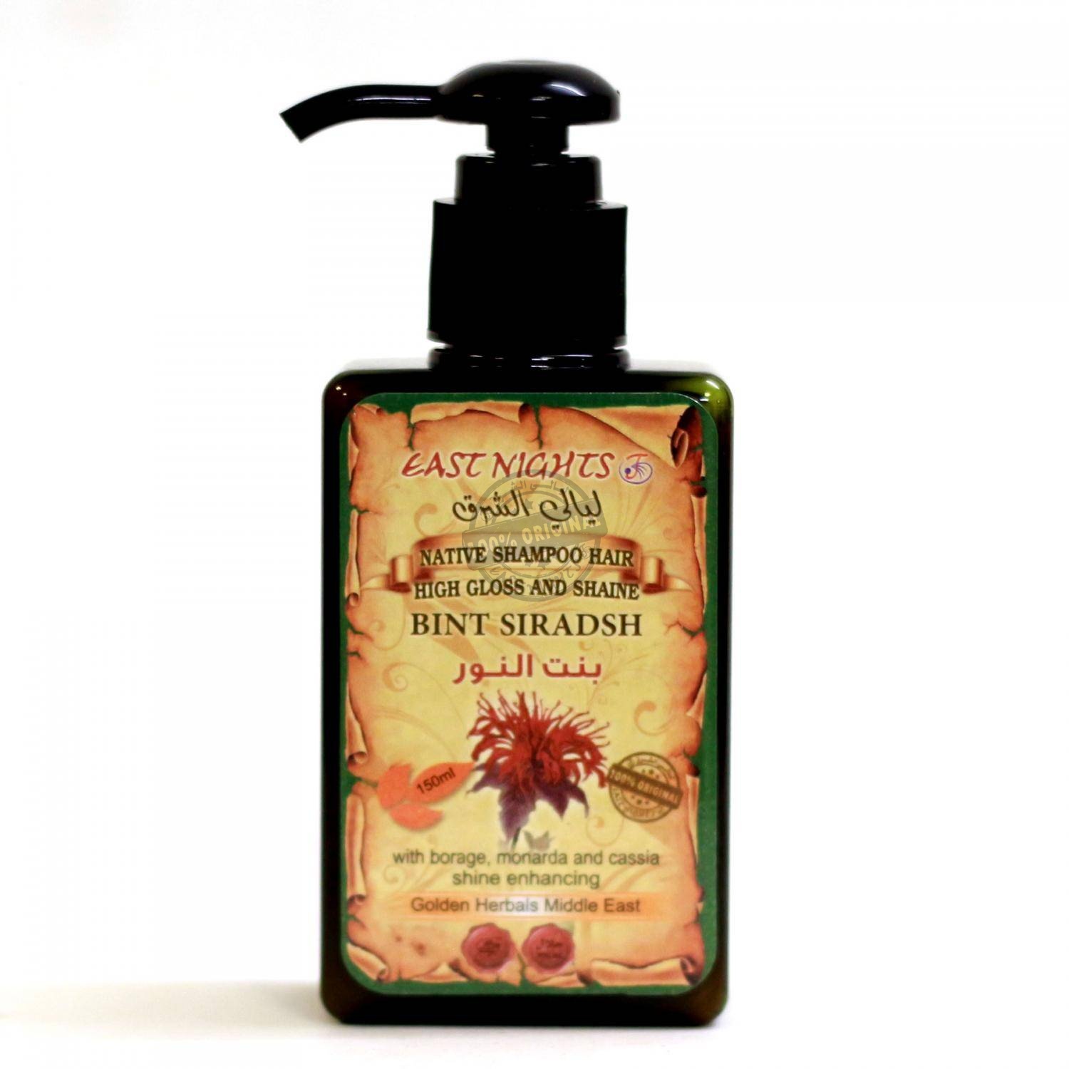 Органический шампунь BINT SIRADSH «Освещающий» создан технологами Национального сирийского производства восточной косметики East Nights для сглаживания пористой структуры волос, а также придания волосам блеска и сияния. Масло семян огуречника успокаивает, питает кожу головы, регулирует выделение кожного сала, способствует регенерации клеток. Придает волосам силу и блеск. Масло монарды оказывает противовоспалительное действие, уплотняет волосы, разглаживает, увеличивает густоту тонких волос. Кассия способствует оздоровлению кожи головы и волос. Добавляет волосам сияющий блеск. Улучшает кровоснабжение, обеспечивает рост густых и блестящих волос.