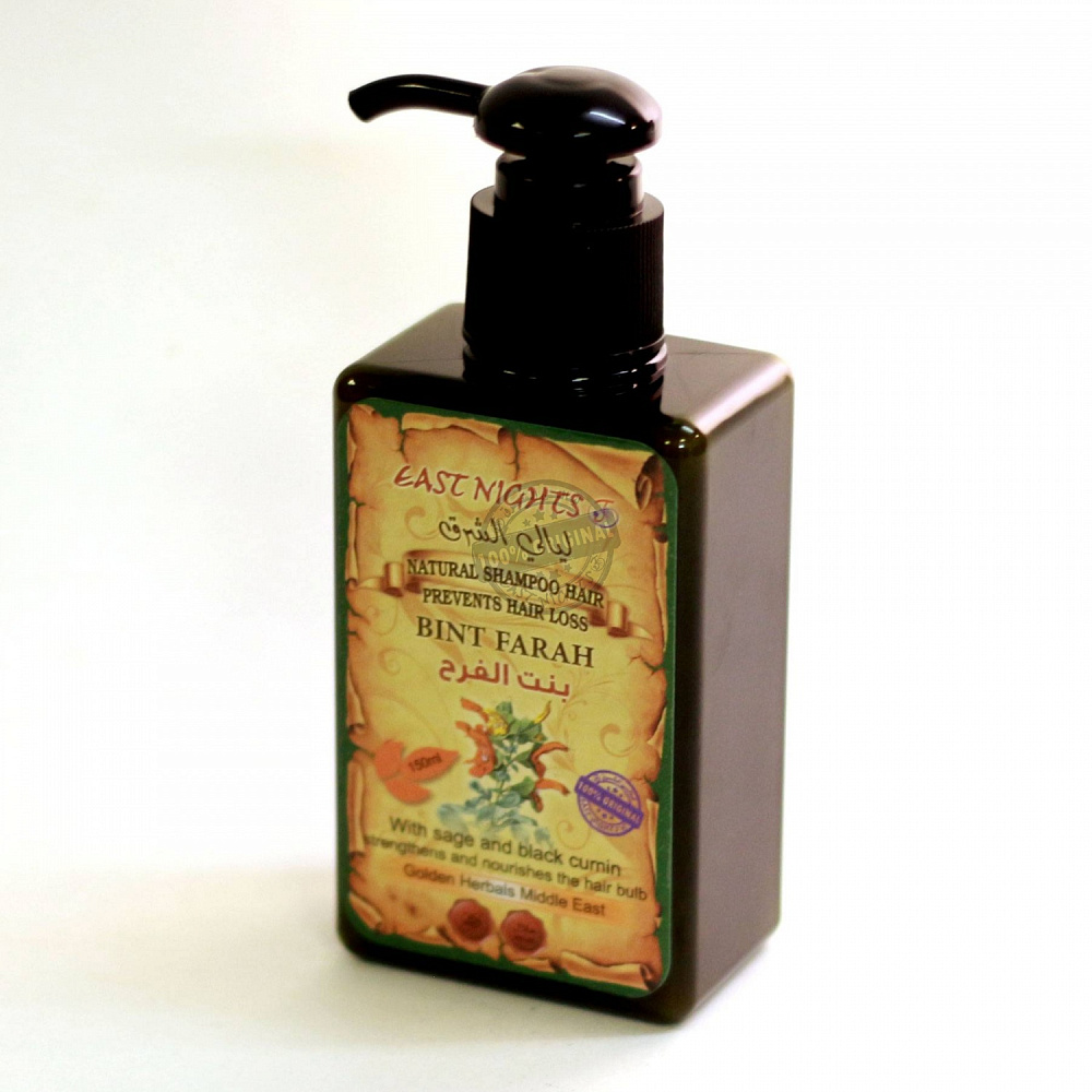 Косметические свойства натурального шампуня против выпадения волос BINT FARAH «Радость» с шалфеем и черным тмином East Nights: