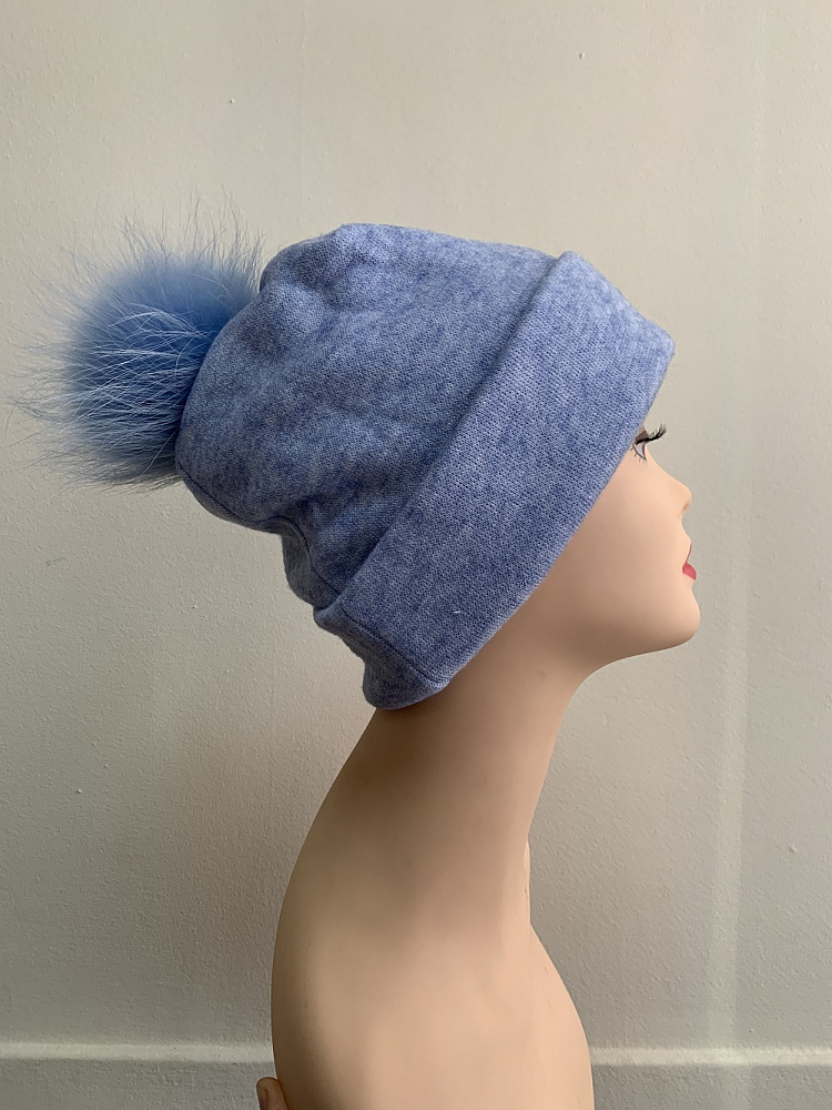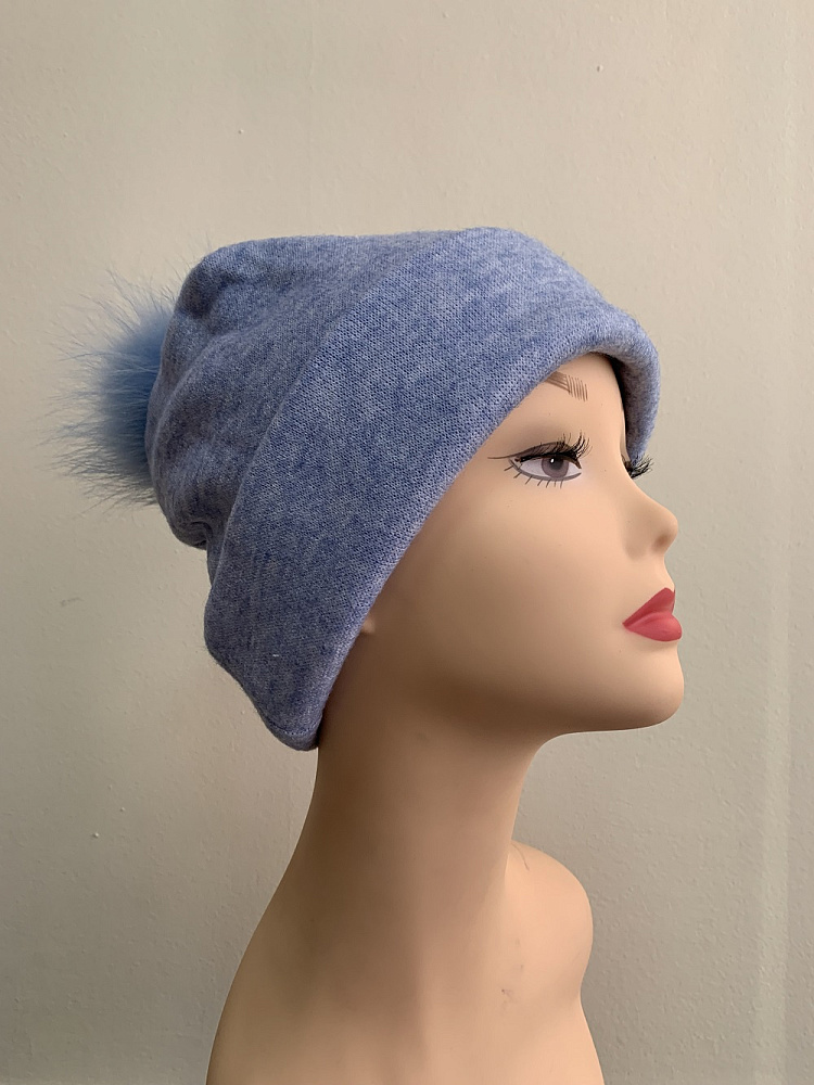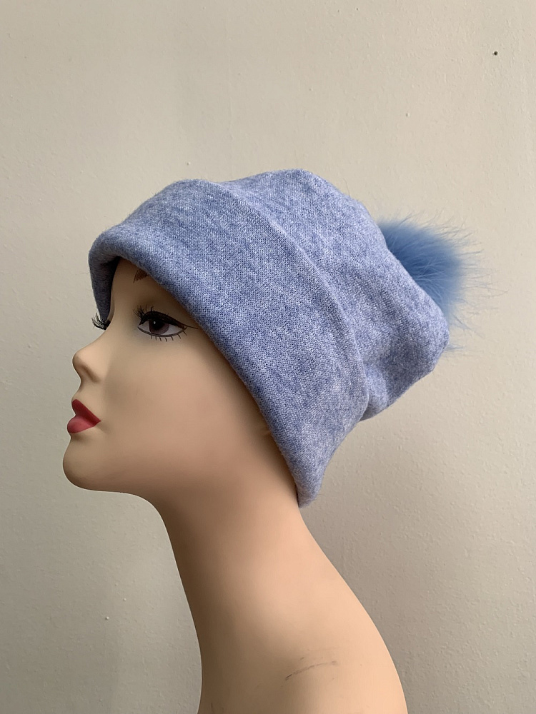 Стильная шапка трикотажа лапша. Помпон из натурального меха енота