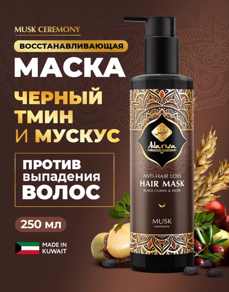 Ищете средство для роста и против выпадения волос? Натуральная маска Adarisa Musk Ceremony станет отличным решением! Эта бессульфатная косметика идеально подходит для женщин, заботящихся о красоте своих прядей. Маска разработана для проблемных волос, склонных к выпадению и избыточной жирности. Использует силу масла черного тмина, протеинов пшеницы и пептидов шелка, чтобы обеспечить питание, укрепление, увлажнение и пробуждение спящих волосяных фолликулов. Продукт предотвращает ломкость волос. Если вы думаете о подарке в день рождения др или нг, эта пептидная маска станет идеальным выбором для мамы, подруги, сестры, бабушки. Косметический продукт обладает восстанавливающим действием и дарит волосам гладкость. Обогащена питательными маслами, что особенно важно для ухода за поврежденными кончиками.
