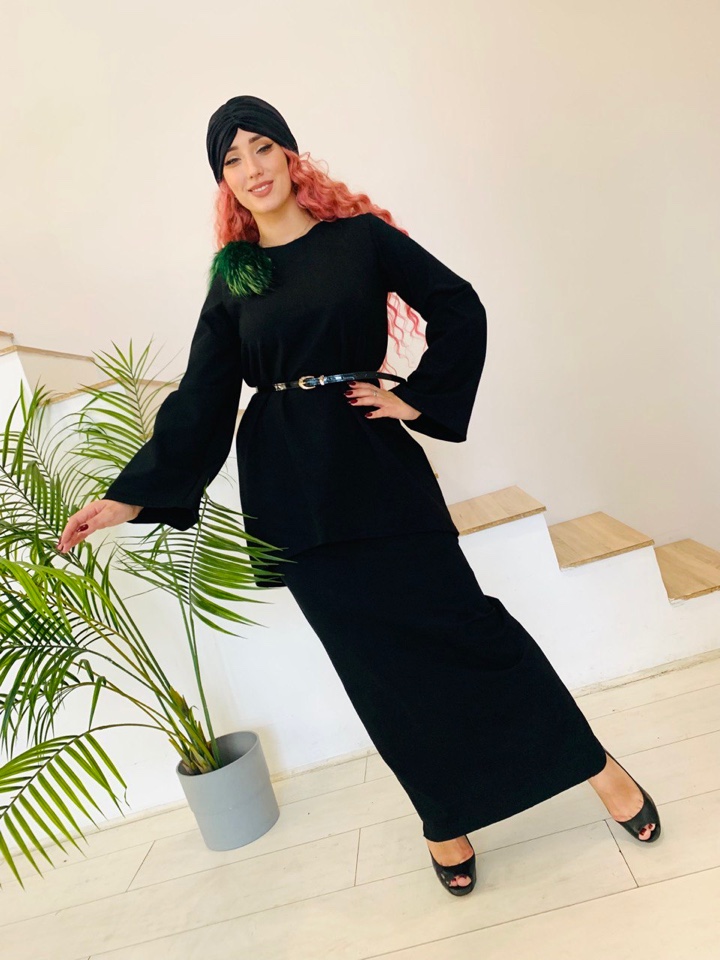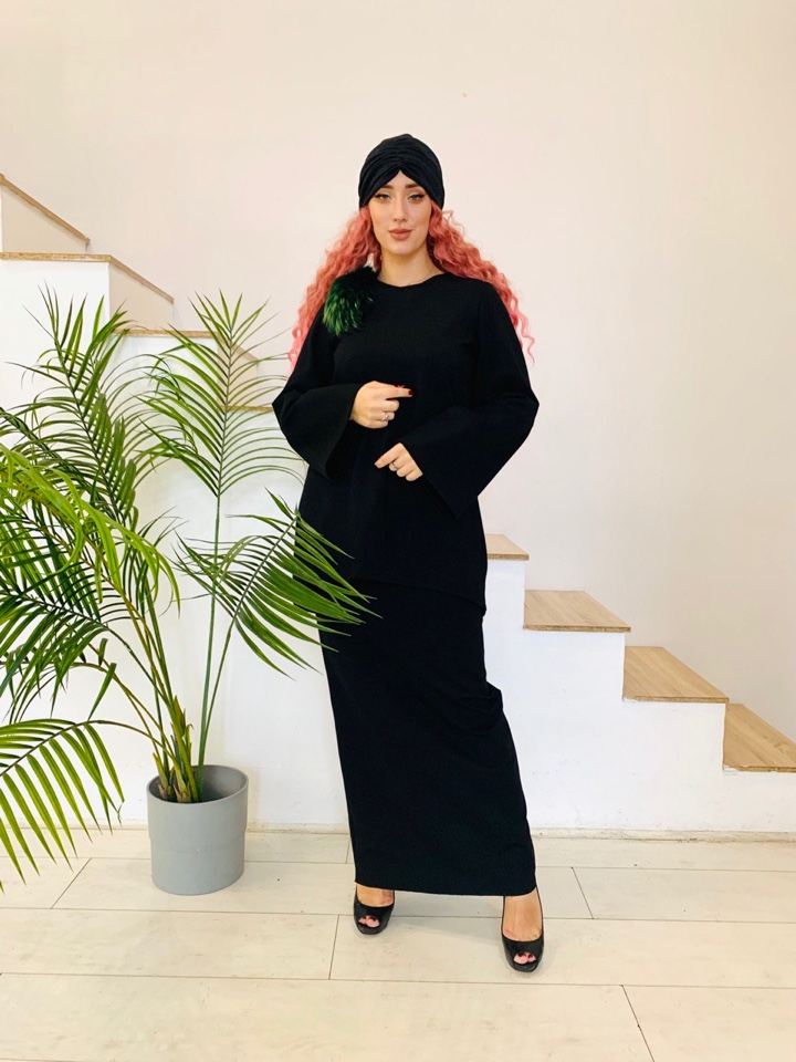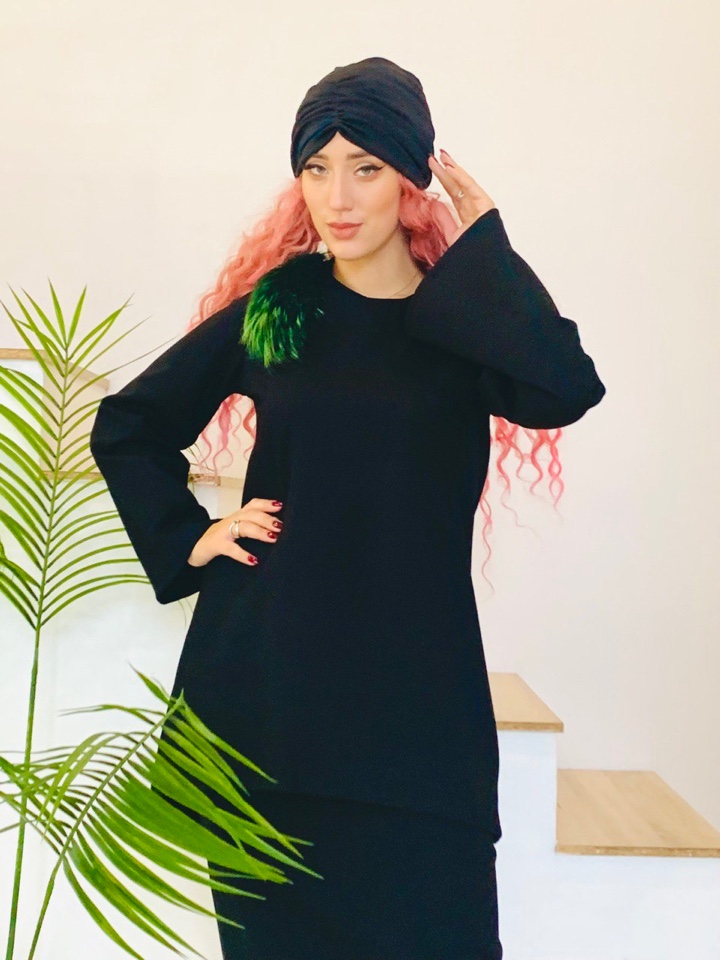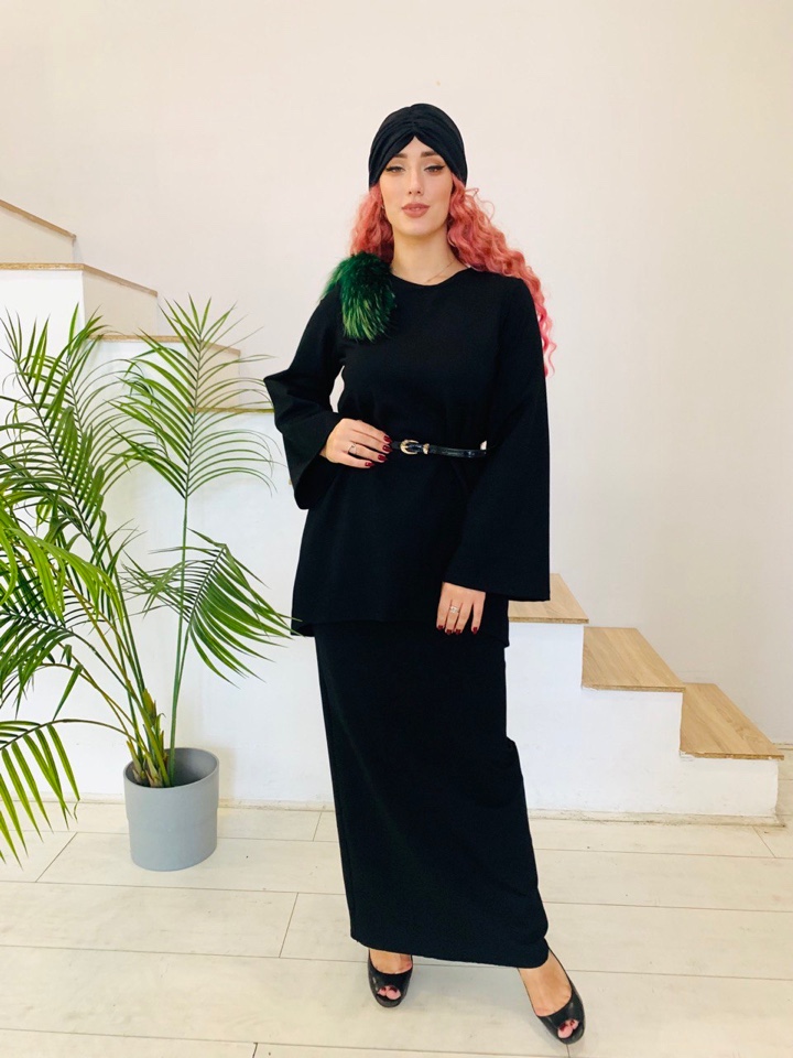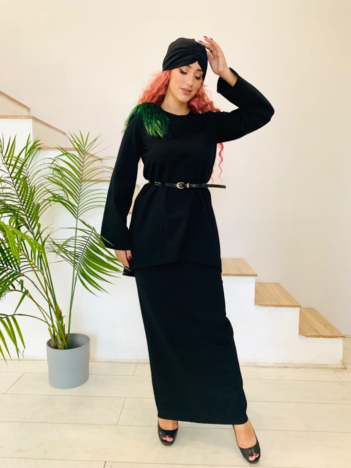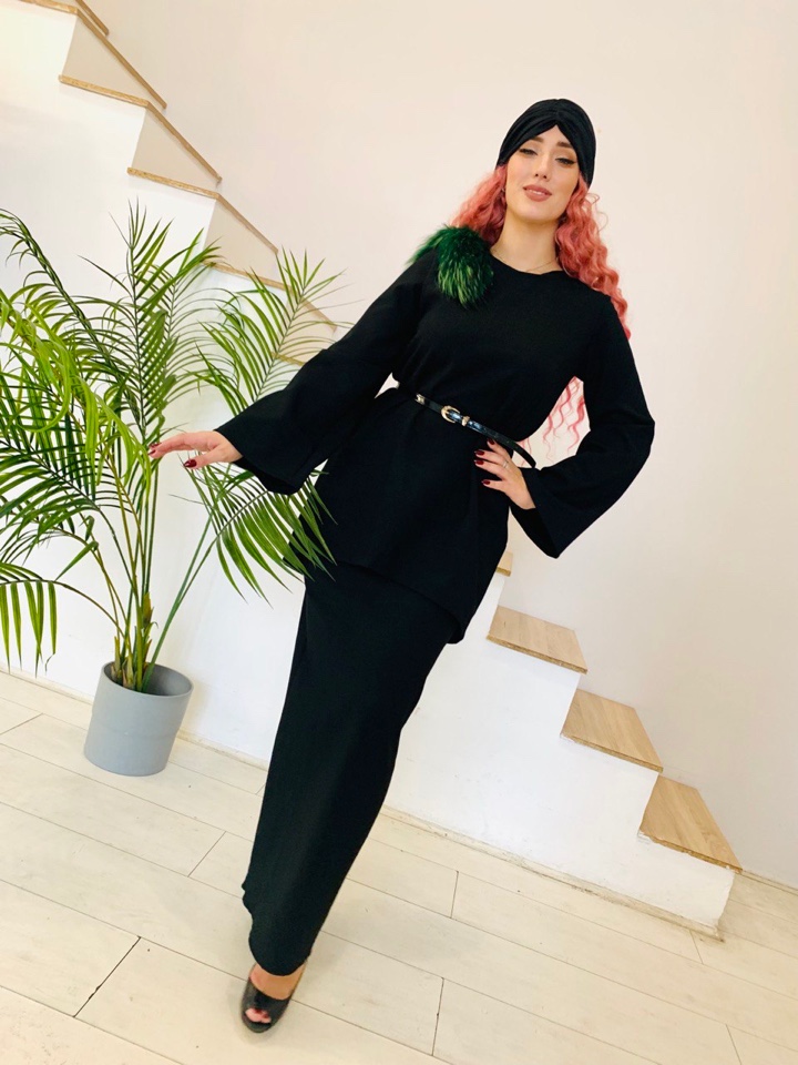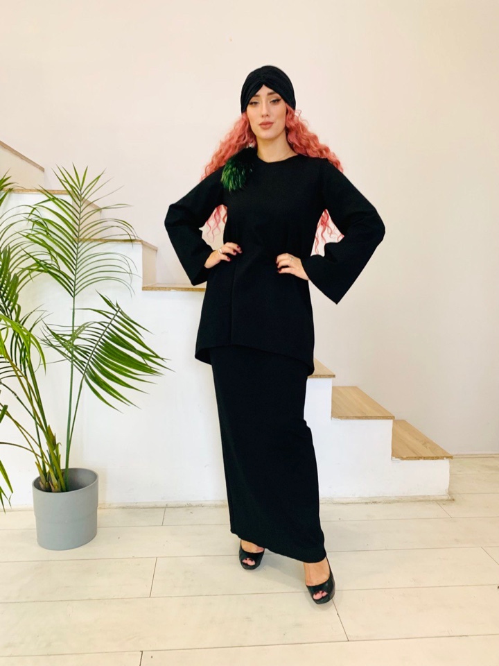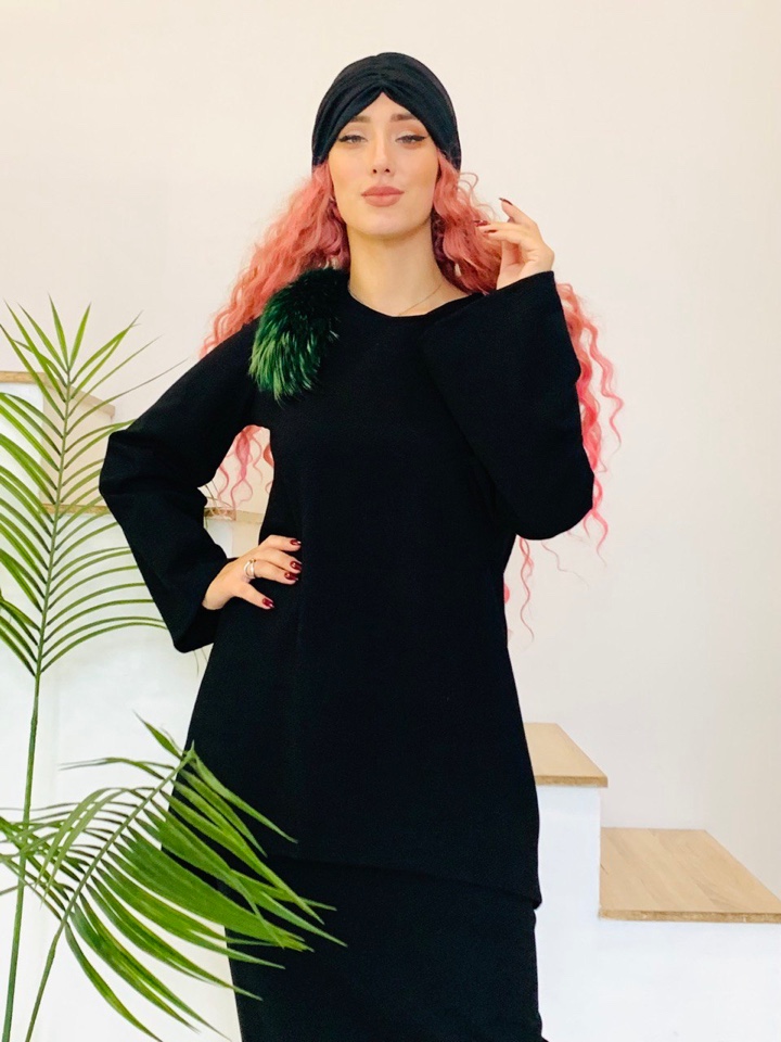 Стильный женский костюм с прямой юбкой. Цвет - черный Ткань - костюмный трикотаж ромэ. Костюм декорирован натуральным мехом на одном плече изумрудного цвета, мех крепится на кнопке, поэтому его можно снять . Чалма и пояс в комплект не входят. Чалму можно заказать отдельно. Костюм состоит из туники удлиненной с переходом длины и прямая юбка. Прекрасный , женственный костюм для любого праздничного мероприятия . Размеры от 44-52