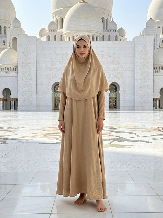Сам химар отличается лаконичностью и простотой, что является его главным достоинством. Он плавно ниспадает, мягко драпируясь и открывая лишь лицо, подчеркивая его естественную красоту. Отсутствие лишних деталей, украшений или сложного кроя делает его универсальным аксессуаром, способным дополнить практически любой наряд. Благодаря такому дизайну, химар не перетягивает внимание на себя, а скорее служит фоном, позволяя раскрыться индивидуальности его обладательницы.