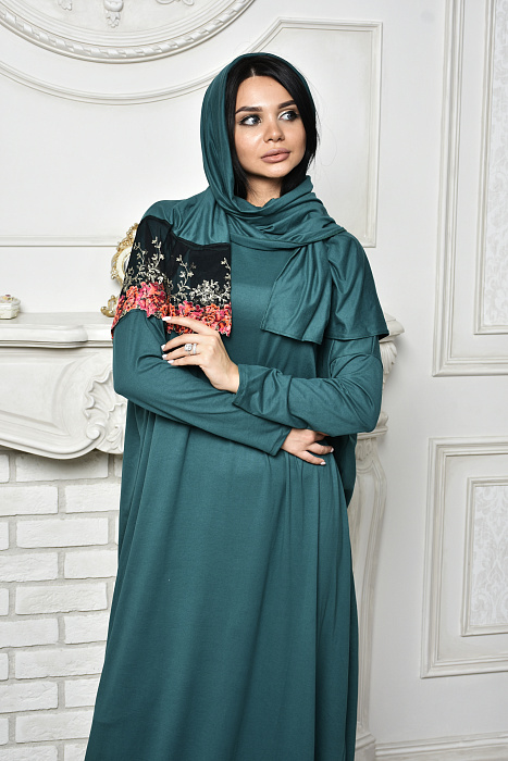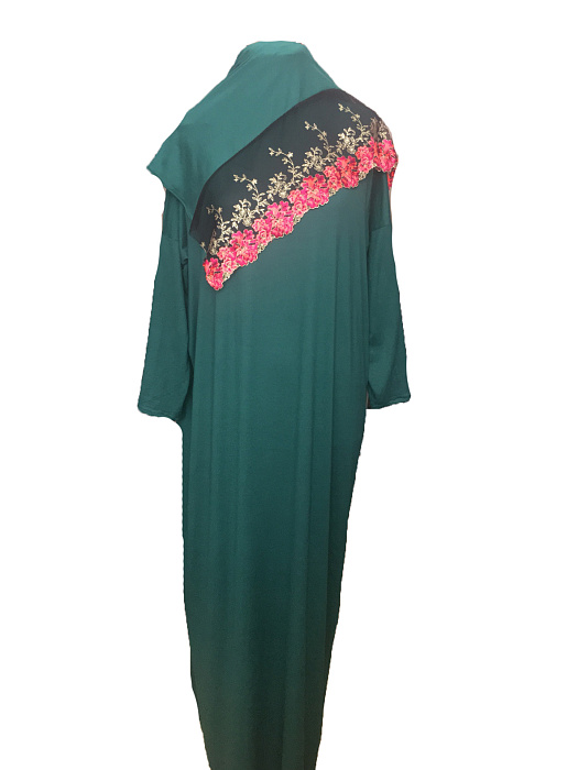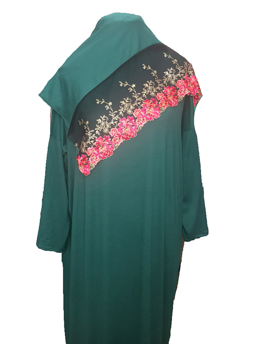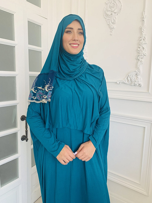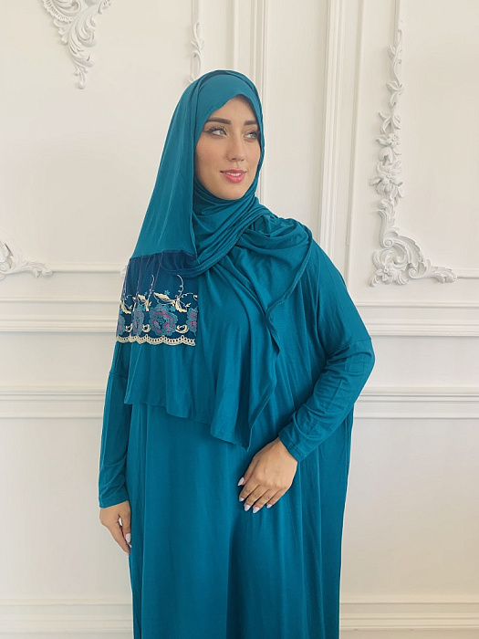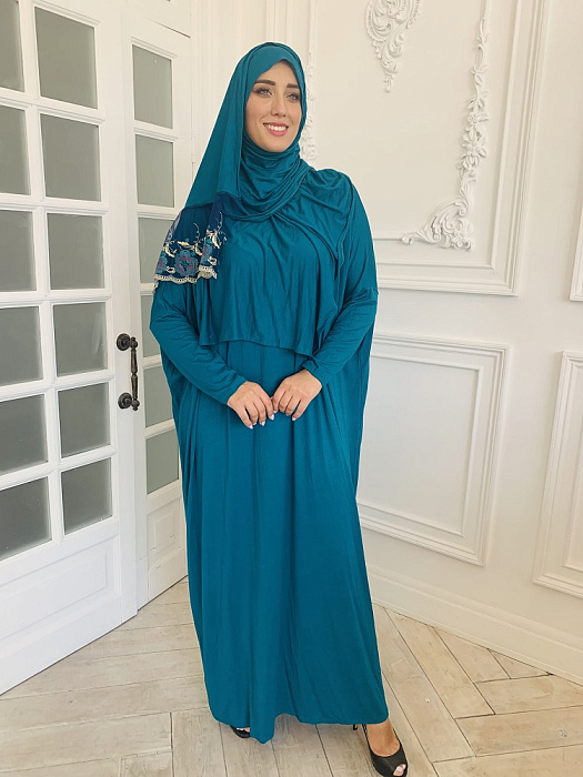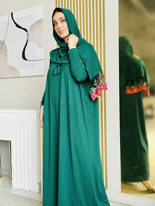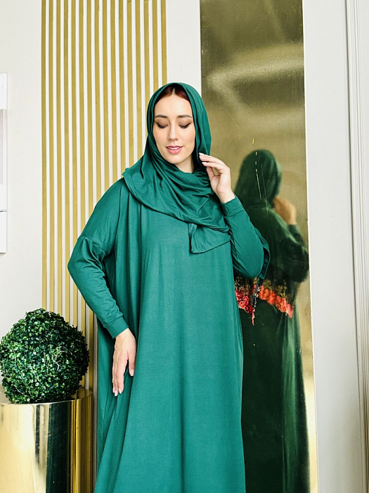 Это платье – воплощение скромности и элегантности, созданное для того, чтобы каждая женщина чувствовала себя комфортно и уверенно во время священной молитвы. Изумрудный цвет, глубокий и насыщенный, символизирует духовный рост и умиротворение, окутывая вас аурой спокойствия и благодати.