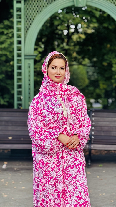 Нежный шелк-вискоза, из которого сшито платье, ласкает кожу, позволяя ей дышать. Легкая и струящаяся ткань деликатно облегает фигуру, не сковывая движений, что особенно важно во время намаза. Благодаря свободному крою оверсайз, платье подойдет женщинам с размером от 42 до 52, обеспечивая максимальный комфорт и свободу.