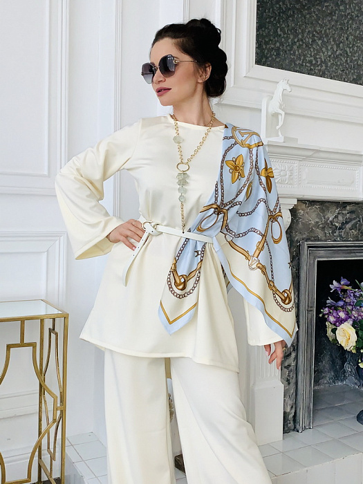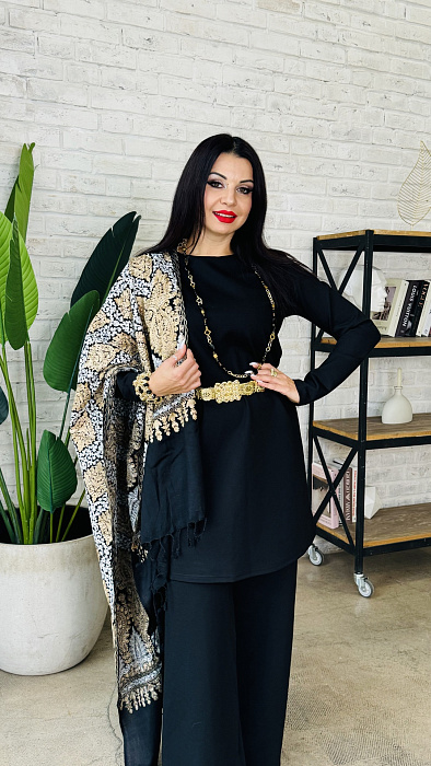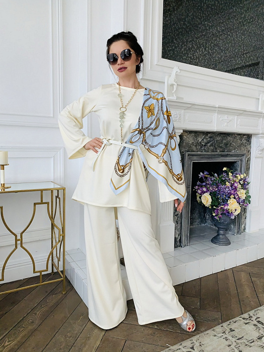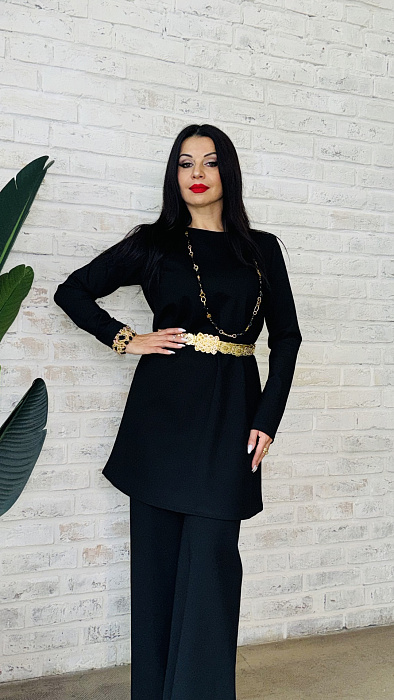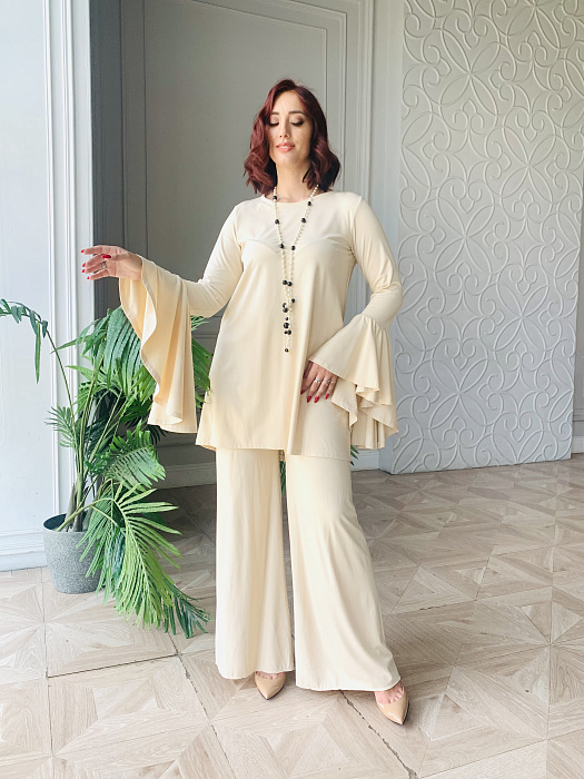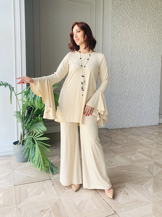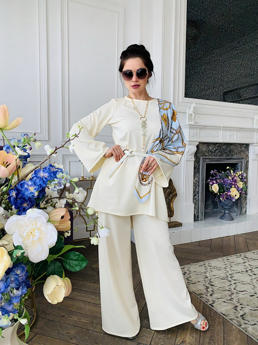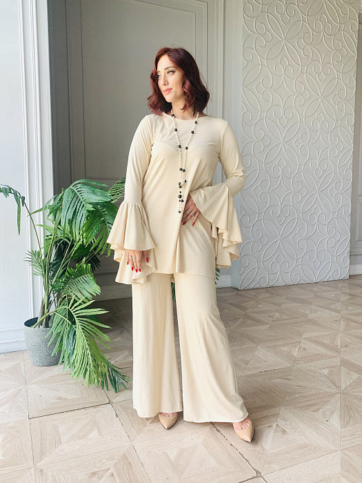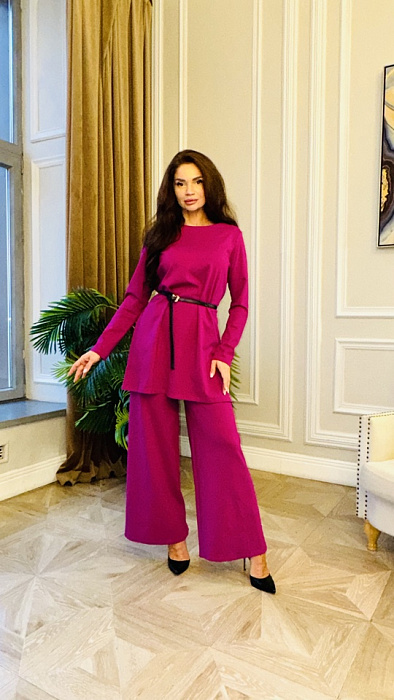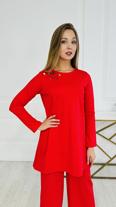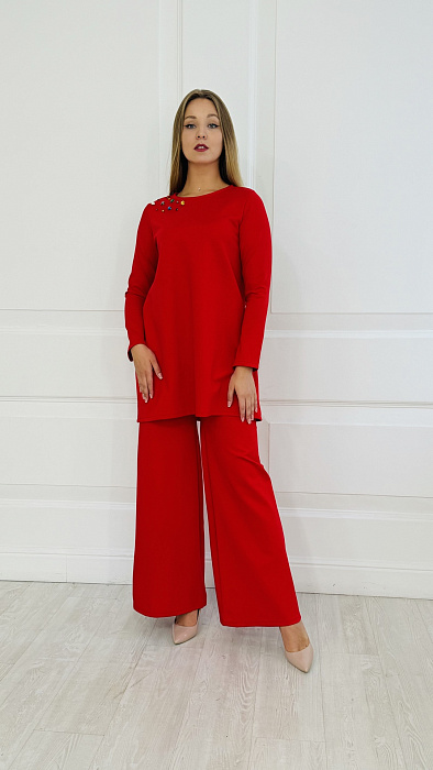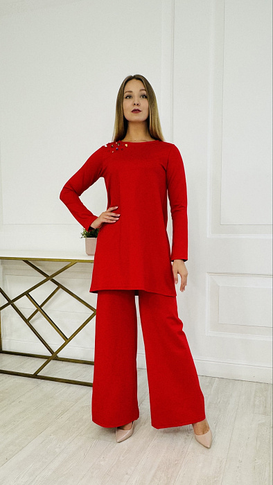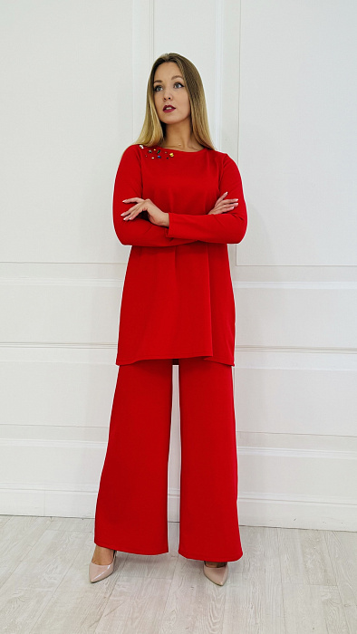 Костюм-двойка – это воплощенная мечта о комфорте и элегантности, где мягкость ткани ромэ встречается с дерзким огнем насыщенного красного цвета. Он создан для женщины, уверенной в себе, не боящейся выделяться из толпы и ценящей роскошь в деталях.