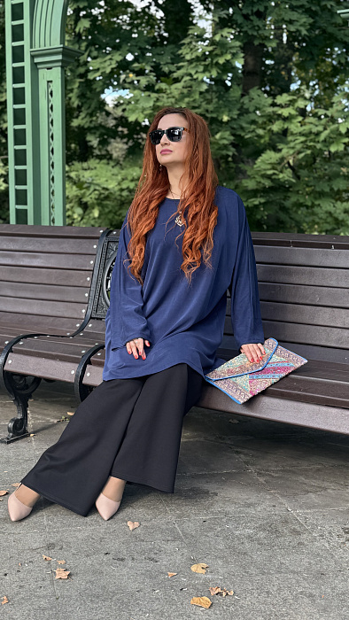 Элегантная туника оверсайз из трикотажа с эффектом велюра. Красивый синий оттенок цвета смотрится привлекательно и изысканно. Подойдет , как повседневная одежда. Идеальная находка для вашего гардероба.