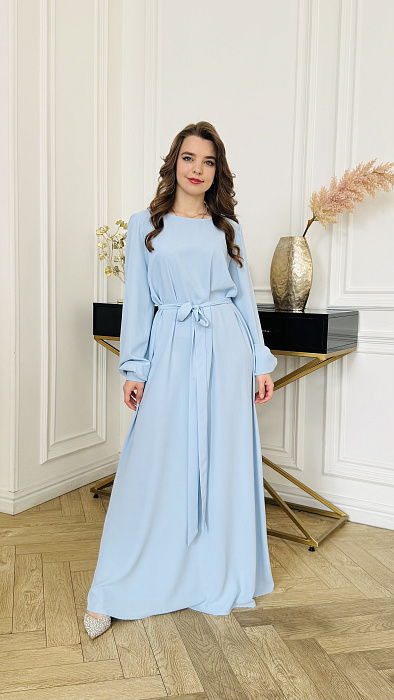 А-силуэт, нестареющая классика, деликатно подчеркивает достоинства фигуры, мягко скрывая нюансы и акцентируя плавность линий. Платье нежно обнимает плечи, спускаясь волной ниспадающей ткани. Длина макси добавляет образу королевского величия, делая его уместным и на залитой солнцем террасе, и на вечернем приеме под мерцающими звездами. Цвет – небесная лазурь, застывшая в шелке.