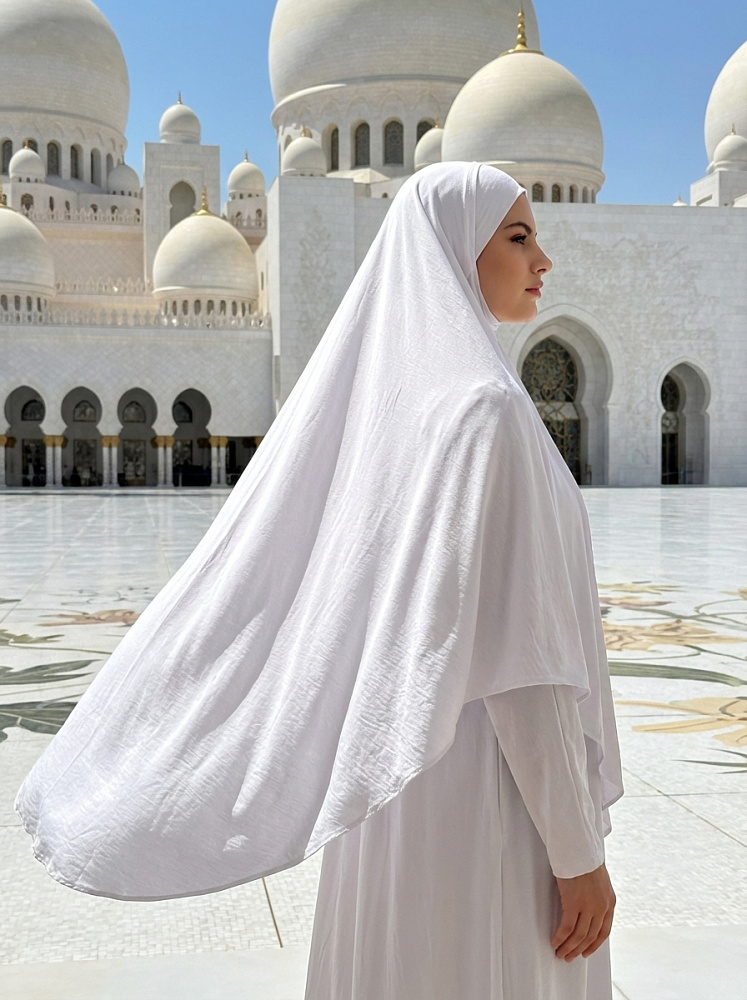Особое внимание заслуживает цвет химара. Цвет чистоты — это цвет белый цвет, спокойствия, надежды и гармонии. Он прекрасно сочетается с белым платьем, которое видно под химаром, создавая образ чистоты и света. Этот цвет универсален, он подходит как для повседневной носки, так и для особых случаев, привнося в образ нотку свежести и элегантности. Ткань, судя по изображению, обладает легкой полупрозрачностью и приятной текстурой, что делает ношение химара комфортным и приятным. В контексте мусульманской культуры химар играет важную роль, являясь не только элементом одежды, но и выражением веры и идентичности. Представленная модель, очевидно, создана с учетом современных представлений о моде и стиле, что делает ее привлекательной для широкого круга мусульманок. Она демонстрирует, как традиционные элементы одежды могут быть адаптированы к современному миру, оставаясь при этом значимыми и стильными. Химар, подобный этому, позволяет женщине чувствовать себя уверенно и комфортно в любой ситуации. Его свободный крой обеспечивает свободу движений, а элегантный внешний вид придает образу утонченность. Он идеально подходит для тех, кто ценит скромность, но при этом не хочет отказываться от возможности выглядеть модно и стильно. Сочетание нежного цвета, легкой ткани и лаконичного дизайна делает этот головной убор настоящим украшением.