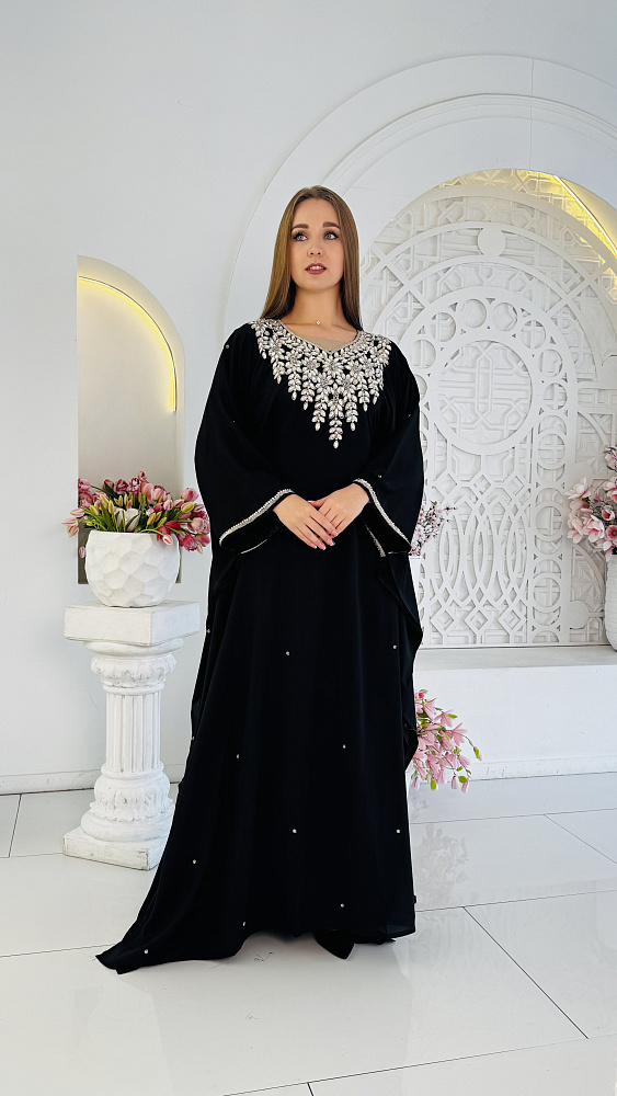 На фотографии представлена элегантная черная арабская абая, представляющая собой стильный образец мусульманской одежды. Основные особенности: Цвет: Классический черный цвет придает абае универсальность и элегантность. Фасон: Абая имеет свободный, прямой крой, обеспечивающий комфорт и соответствующий требованиям скромности. Вышивка: Воротник и частично грудь украшены изысканной вышивкой из белых камней и бисера. Вышивка выполнена в виде стилизованных цветочных мотивов и листьев, что придает наряду нарядный вид. Детали: Рукава абаи широкие, три четверти, также декорированы небольшой полоской вышивки по краю. На самом платье присутствуют отдельные элементы вышивки, разбросанные по ткани. Ткань: Ткань выглядит матовой и плотной, что соответствует требованиям мусульманской одежды. Эта абая сочетает в себе традиционный фасон и современный дизайн, делая ее подходящей для особых случаев и религиозных праздников.