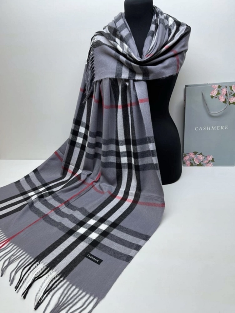 Стильный кашемировый палантин серая клетка , размер 80*190