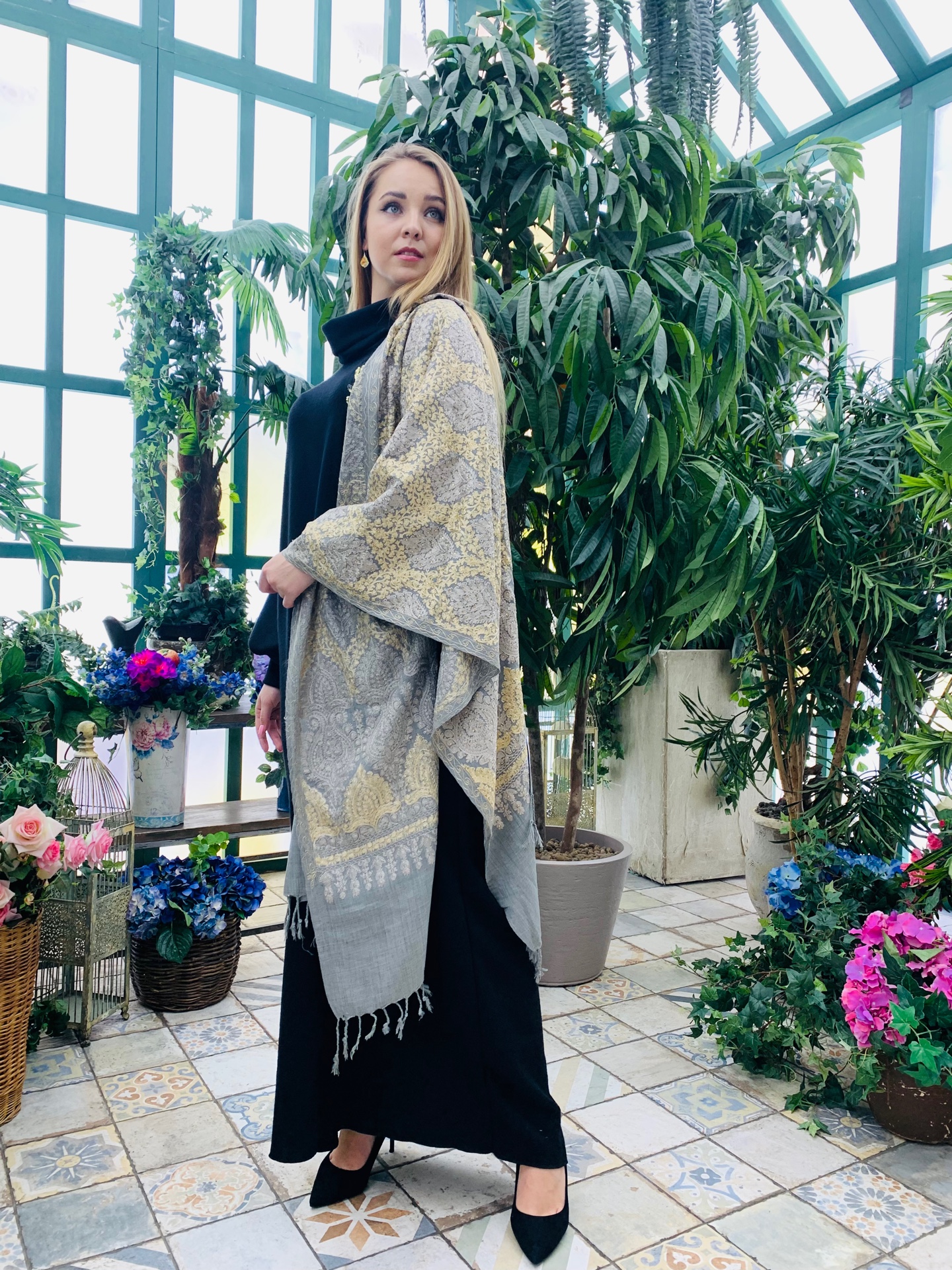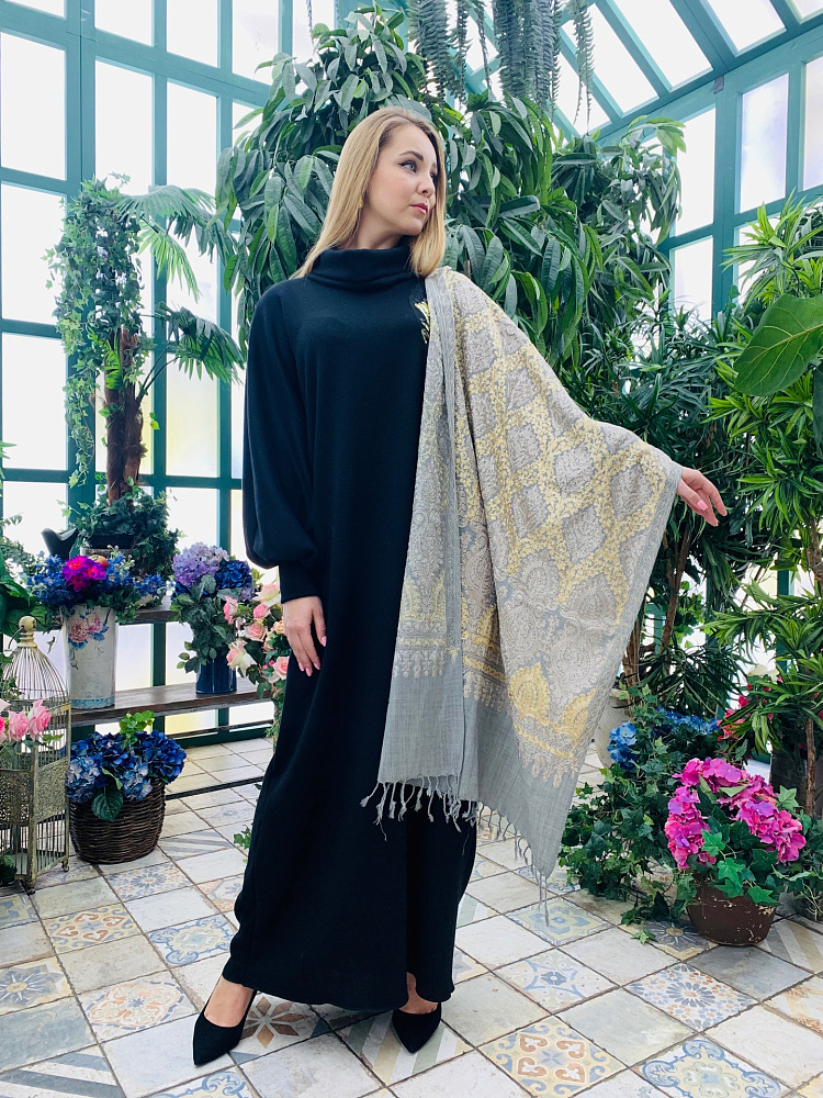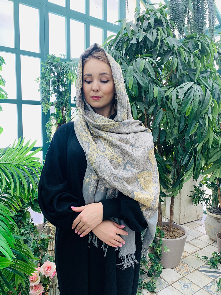 Шикарая шаль из кашемира с вышивкой и декором из страз. Цвет -серый с бежевым. Размер 100 на 190. Производство Индия