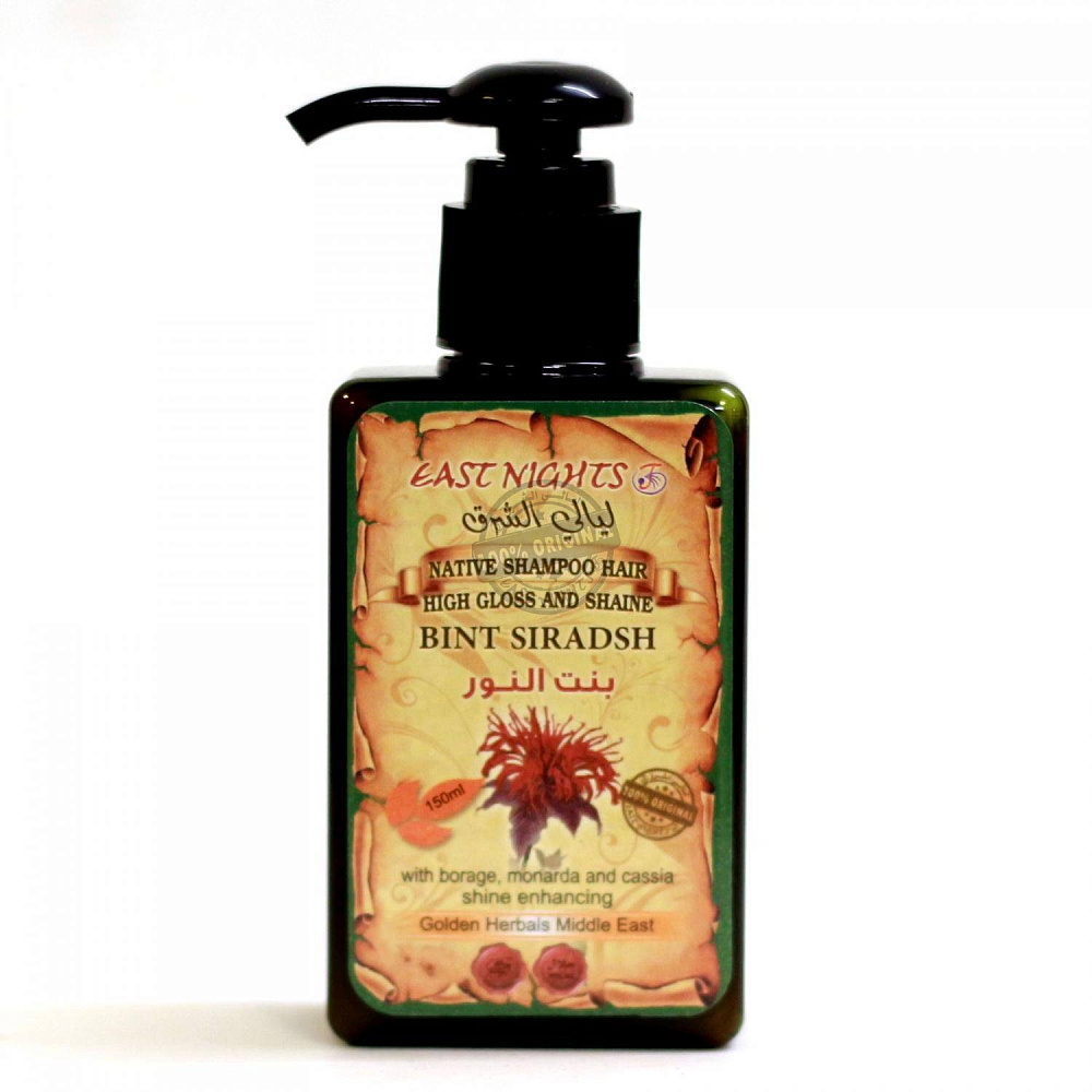 Органический шампунь BINT SIRADSH «Освещающий» создан технологами Национального сирийского производства восточной косметики East Nights для сглаживания пористой структуры волос, а также придания волосам блеска и сияния. Масло семян огуречника успокаивает, питает кожу головы, регулирует выделение кожного сала, способствует регенерации клеток. Придает волосам силу и блеск. Масло монарды оказывает противовоспалительное действие, уплотняет волосы, разглаживает, увеличивает густоту тонких волос. Кассия способствует оздоровлению кожи головы и волос. Добавляет волосам сияющий блеск. Улучшает кровоснабжение, обеспечивает рост густых и блестящих волос.