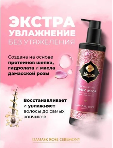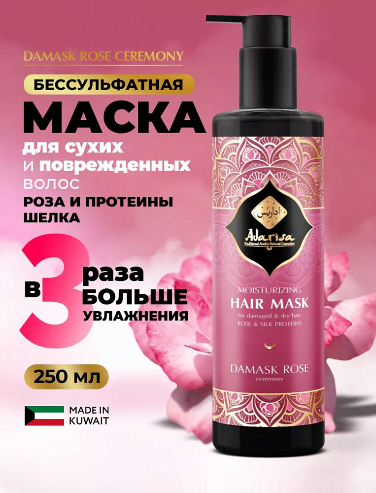 Бессульфатная увлажняющая маска с дамасской розой и протеинами шелка для сухих и поврежденных волос от марки Adarisa. Прекрасное средство для оживления и восстановления ваших локонов любого типа, подходит всем. Нежная, в меру плотная консистенция легко наносится, равномерно распределяется, отлично впитывается, не утяжеляет и не склеивает пряди, хорошо смывается.